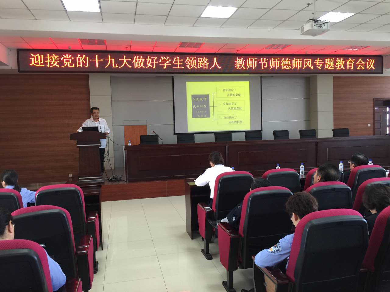 为庆祝第33个教师节的到来,喜迎党的十九大, 9月6日下午,我院召开教师节师德师风专题教育会议。院长刘景辉、党委副书记迟文秀、纪委书记张志平、副院长韩广海、副院长杨威出席了会议,会议邀请了吉林师范大学博达学院中文系主任二级教授侯云龙老师做专题报告。全院教职工参加会议。